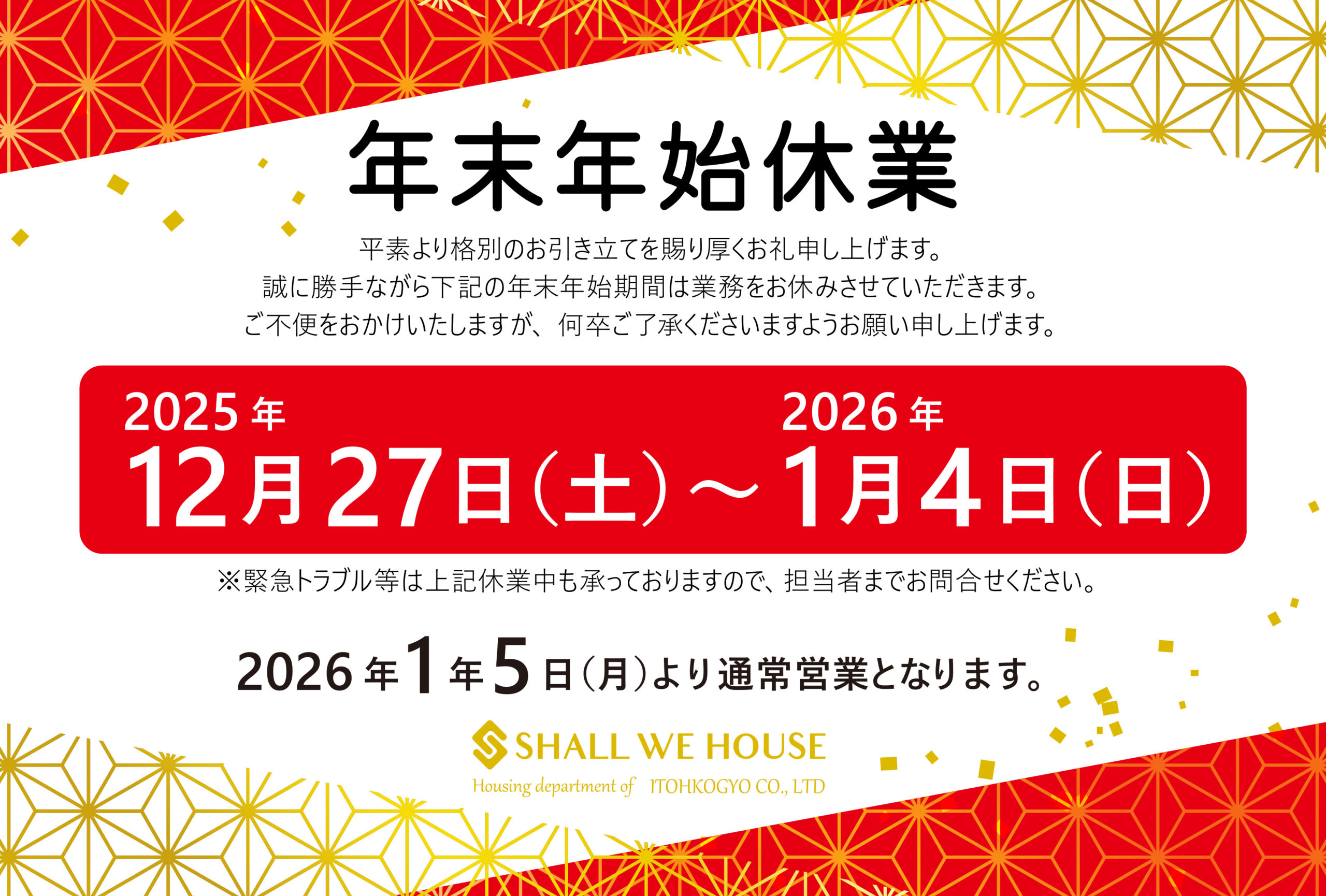 2026年は1月5日(月)より、通常業務を開始します。
