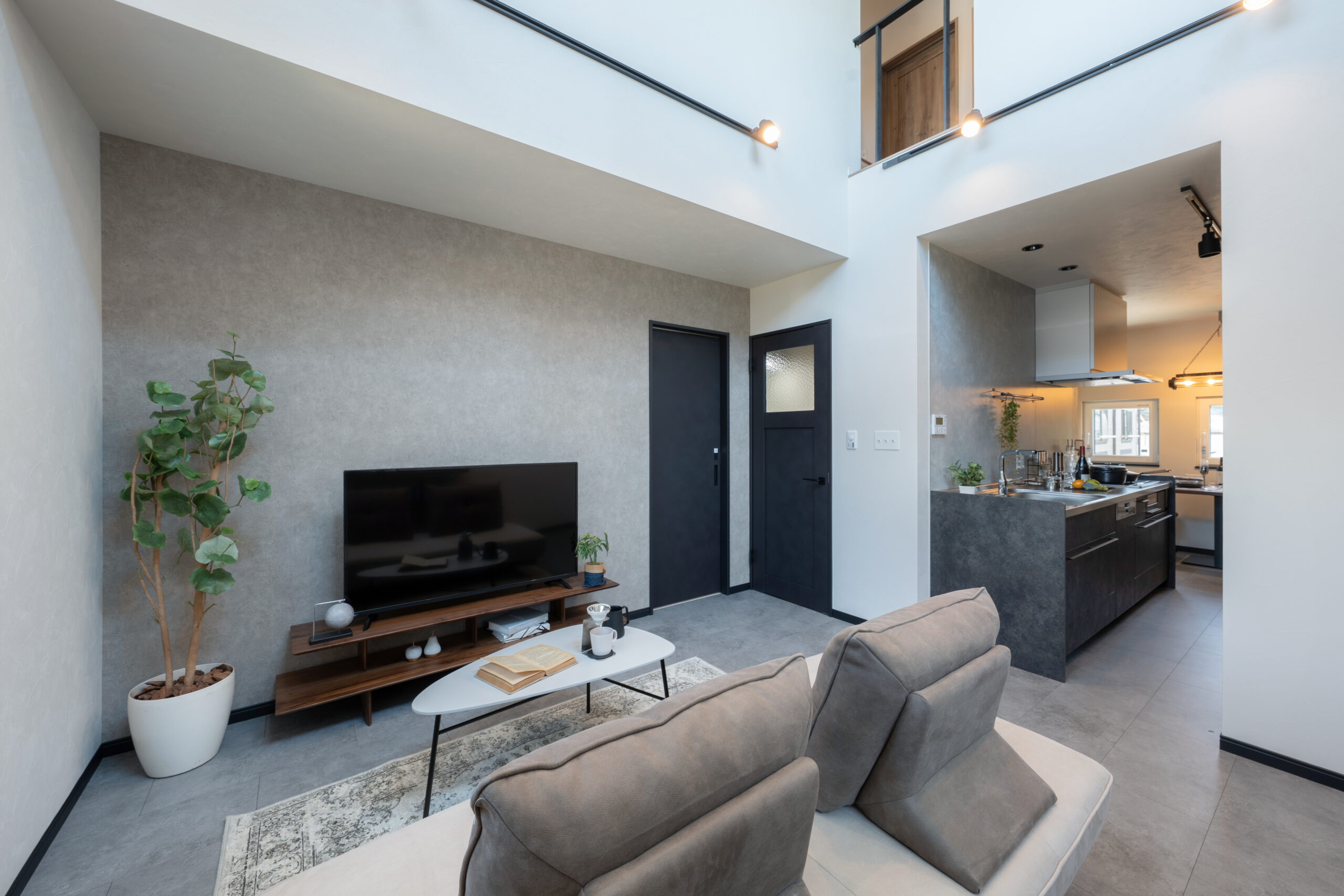 リビングには吹き抜けを設け、縦の広がりで開放感を演出。